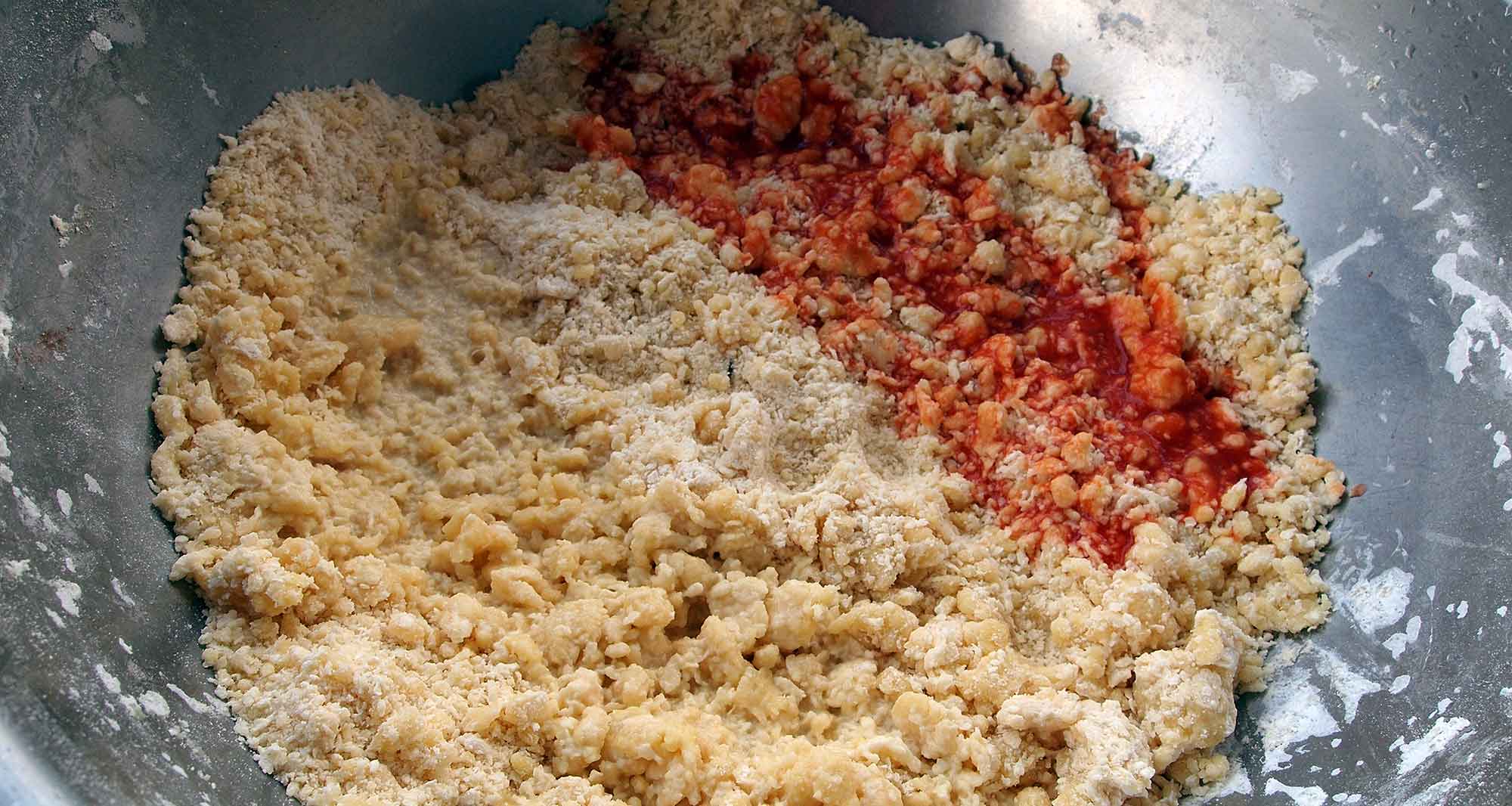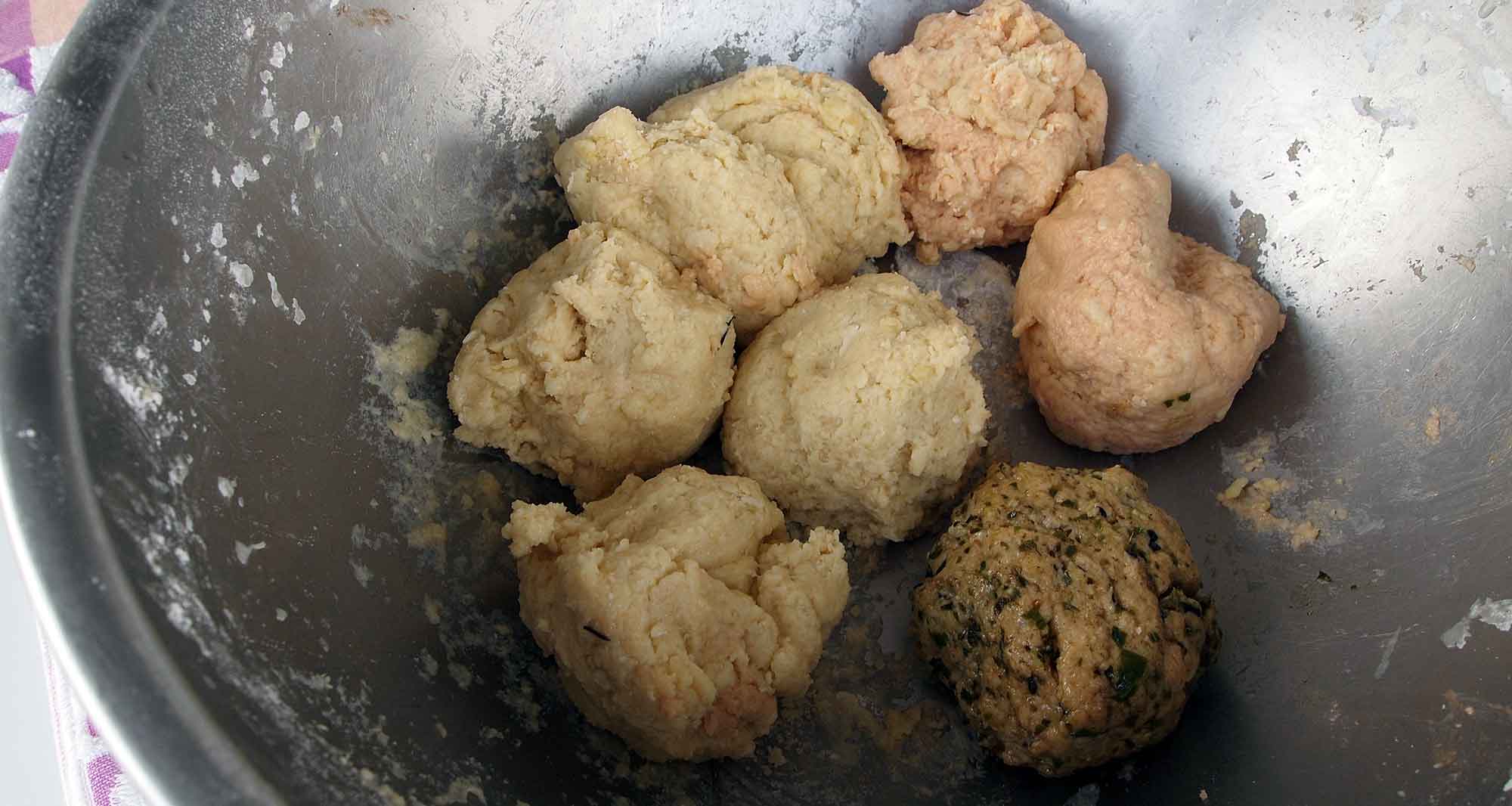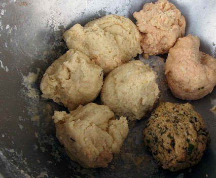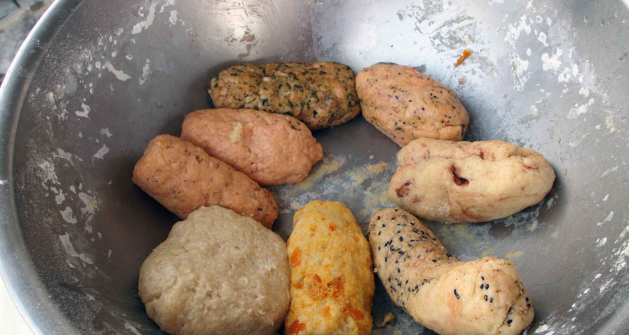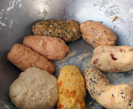 【練り込む材料は、基本生地1/8(だいたいの目分量)に、それぞれ加えます(練り込む材料はお好みで山椒・桜エビ・チョコなどでもOK)】