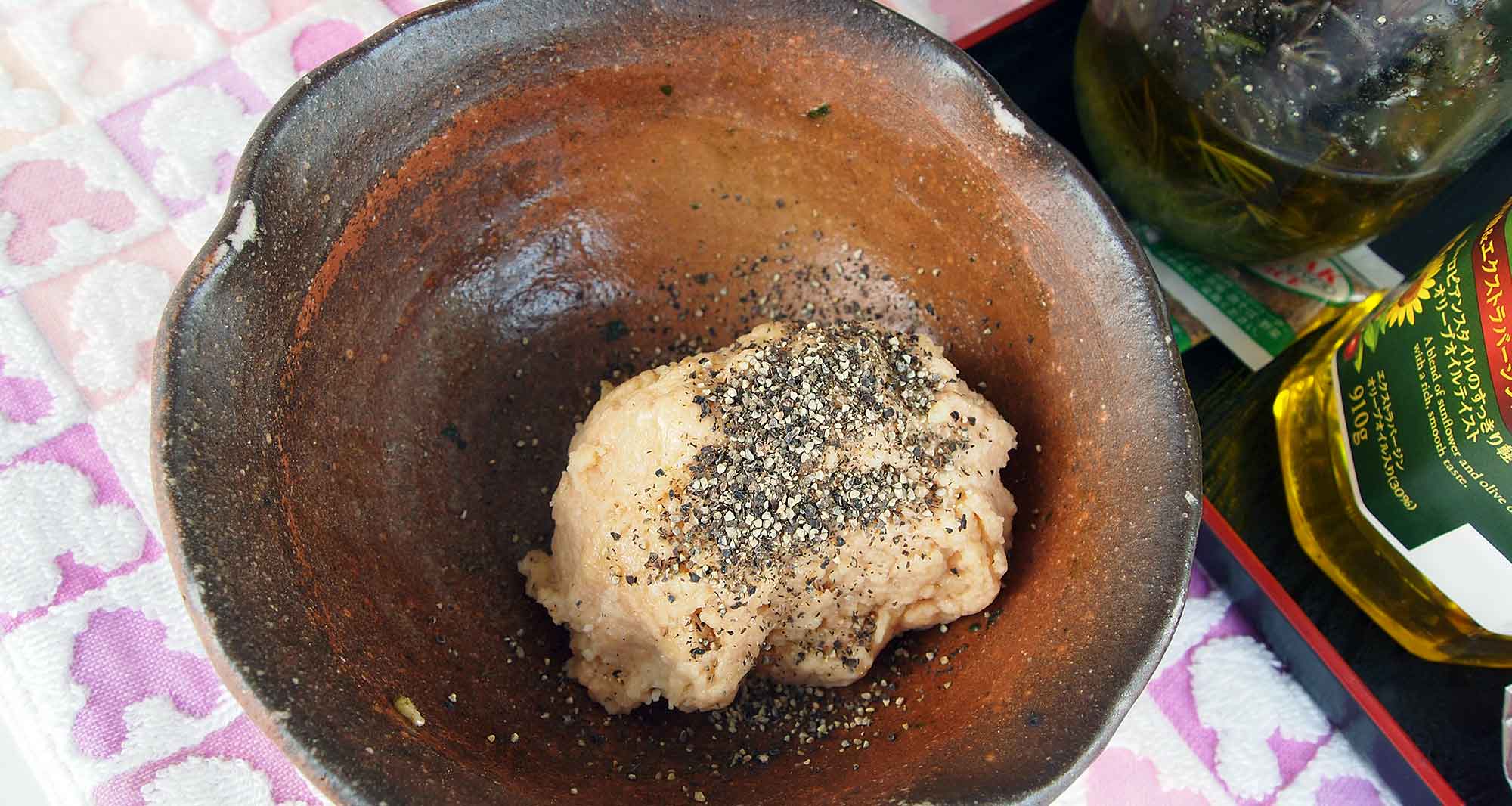 【豆乳と野菜ジュースは、薄力粉:砂糖:オリーブオイルをザックリ混ぜた生地に少しずつ加え、耳たぶくらいの柔らかさまで加えればOK】